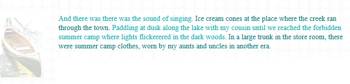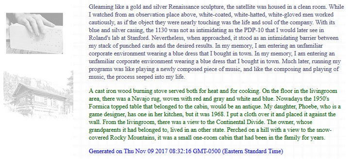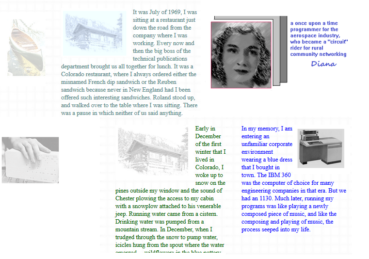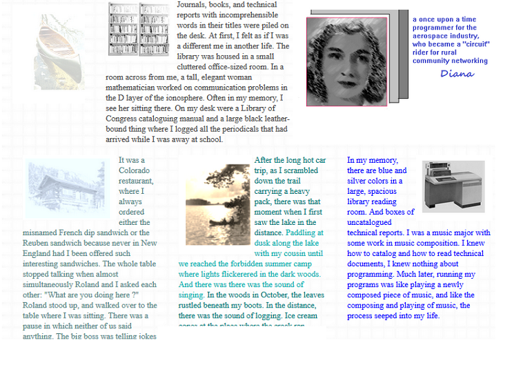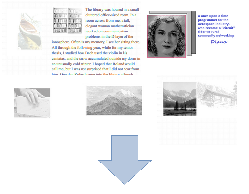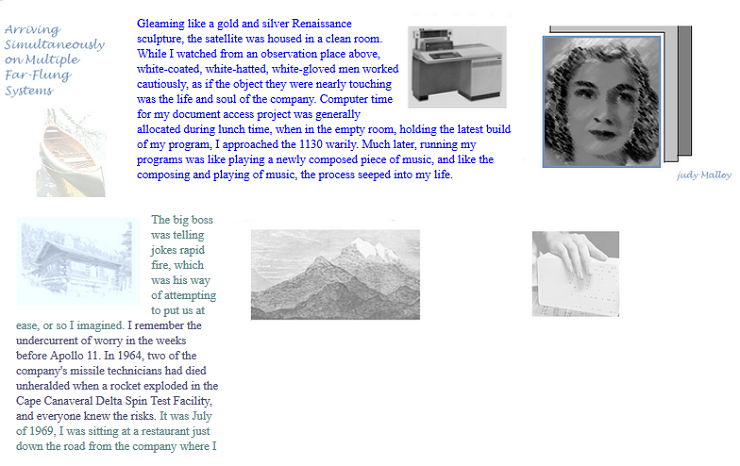 3. Images. The images in Arriving Simultaneously on Multiple Far-Flung Systems are planned to be flexible, by which I mean that the texts they refer to will change. For instance, the cabin image initially combines with Diana's workplace, but it will also combine with her love affair with and eventual marriage to Roland. A chart of all the images in Arriving Simultaneously (so far) needs to be created and keyed to credits to the source of each image. Although I used images as icons to key text in maps; in my card catalog The Woodpile (1979); in the early web version of the Blue Notebook (Uncle Roger File 2); as well as in A Party at Silver Beach, the use of images in my work has not been predominant since the days of making maps and "card catalog"-based narratives. Thus, I would like to also call attention to JR Carpenter's algorithmic electronic manuscripts, created with integrated images and generative text -- as well as to Deena Larsen's combinations of images and text in Marble Springs -- as being innovative examples of the use of images in conjunction with story-bearing text [..] In the case of Arriving Simultaneously, because the text is generated from different modules, ultimately, the images are important in situating the reader within fluctuating time-frames in the narrator's life. In order that they be meaning-laden but not didactic, many of the images are designed to fade unobtrusively into the background.