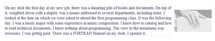 November 25, 2017 O n Thanksgiving Day. it was a pleasure to talk with my family in California, and then I made some variations in the interface design of the first dynamic Arriving Simultaneously on Multiple Far-Flung Systems manuscript. Later, sitting in the woods (evading the FORTRAN IV manual), I went back in time to write a little more for the "route 128" array. It was a beautiful winter day, and somehow I veered into working at the Harvard Coop bookstore during Christmas vacations -- an experience I like to remember. So, I gave it to Diana. For the record, this being a notebook, a few examples of the current interface design and of the new text in the output are recorded below. The purpose of doing this is to compare the changes with what existed before. Sometimes -- this may be one of those times -- a decision to revert to the original may be made.