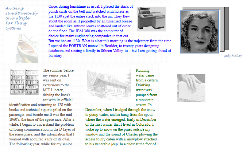 [...]When the kaleidoscope icon appears and is selected, the reader moves to an environment with fewer rogue punch cards. Instead, various playable iterations of the manuscript appear. [...]I admit to remembered sadness when this icon and text were put in place. It is clear that Diana will soon be leaving the mountains. R egarding, the difference between Jenny's experience of [chip industry] tech industry culture in Uncle Roger and Diana's experience of tech industry culture in Arriving Simultaneously on Multiple Far-Flung Systems, I would like to emphasize that both Ball Aerospace and Xerox PARC were important, productive, and harassment-free experiences. Working for an aerospace company at the height of the space race was an unforgettable view of space technology. Furthermore, Ball gave teams and individuals the access and power to develop needed systems on their own initiative and in this way encouraged invention and innovation. Twenty years later, at a different time of my life, Xerox PARC was the most hospitable environment I have ever experienced as regards not only my own work, but also the experience of an office in PARC's legendary Computer Science Lab (CSL) with access to an unparalleled array of research and development -- and later the opportunity to work with distinguished hypertext programmer, Cathy Marshall. It is important that young woman, who want to become software engineers, are aware that in the real world, there are welcoming environments. [...]The story relevant to today's notebook entry is the emergence of histories of women and engineers/software engineers in space exploration. As the Mercury 13 woman astronauts found out in the 1960's, there were glass ceilings. Nevertheless, the work of the black women mathematicians/computer programmers at Langley -- and the work of the women mathematicians and computer programmers at JPL, including Chinese American Helen Ling and African American Janez Lawson -- was extraordinary. Arriving Simultaneously draws on my own much earlier experience in working with information technology at Ball Aerospace (then BBRC) in the late 1960's. But it is a pleasure to note that 25 years later the number of women at Ball Aerospace and JPL who worked in core positions on the Deep Impact Mission (launched in 2005) is inspirational. They included Systems Engineering Lead Amy Walsh, a 2006 Women In Aerospace Award Winner for her work on Deep Impact (Ball); Senior Engineer, Lorna Hess-Frey, Flyby Structures & Mechanisms Lead, Deep Impact (Ball); Michelle Goldman, Project Engineer in Systems Testing, Deep Impact (Ball); and Jennifer Rocca, Launch Activity Lead, Deep Impact (JPL). Astronomer Karen J. Meech at the University of Hawaii was the Coordinator of Earth-Based Observations. Other women who worked on Deep Impact were Systems Design Engineer Sheryl Atterberg (Ball); Software Stress Tester Kavita Kaur (JPL); and Leticia Montanez, Testbed Manager, Deep Impact (JPL). Much of this history (of course also focusing on the work of the male engineers), is well documented in Todd Neff's From Jars to the Stars: How Ball came to build a comet-hunting machine. (Denver, CO: Earthview Media, 2010) Because of its detailed documentation of the development of an amazing array of systems, this book is of value to anyone interested in innovation --- including new media artists. C ontingently, I am thrilled to see that this Spring, the University of Illinois Press will be releasing New Media Futures The Rise of Women in the Digital Arts, edited by Donna Cox, Ellen Sandor, and Janine Fron; Forewords by Lisa Wainwright, Anne Balsamo, and Judy Malloy. As I noted in my foreword to this book: "Presenting individual histories as situated in the development of the technologies themselves, New Media Futures not only provides multiple models for women interested in exploring the computer-mediated creative arts but also documents the challenges of creating digital art from the late seventies to the early nineties. Application software, for instance, was unlikely at the time when many of the artists in this book began working. Explanatory books were scarce; programs were created from scratch, often taking the form of a stack of punch cards. As Lucy Petrovic, whose work focuses on human-computer interactivity and virtual reality environments, observes in this book: 'We were writing code, step-by-step. Initially that was the only way to create art on the computer.' " |