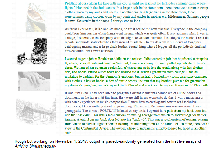 T he images above depict reader movement from the top page, to reader "on-the-fly" generation of the first manuscript of Arriving Simultaneously on Multiple Far-Flung Systems, to an accessible single array-displaying window. I look forward to generating all the arrays in a continuous printout. Meanwhile, composition observations are recorded here. 1. In Uncle Roger File 3 and its name was Penelope, I coded generative hypertext to create narratives where the meaning slowly built up in unpredictable ways. A part of the composition process was to continually replay the work until I was certain that the lexias worked together in whatever order the reader received them. Later, recollected on this early morning was composed with looping, interlocked lexias that slowly revealed submerged narrative information about the life of a woman artist. Although inspired by the recollected interface, Arriving Simultaneously is designed to reflect the life of a woman programmer. Thus, it is a dynamic manuscript, created/recreated with JavaScript in a HTML/CSS structure and read "on-the-fly". Visual icons give Arriving a playable feel, as well as contributing to reader control of the manuscript. However, like the bat(s) in Gregory Yob's Hunt the Wumpus, the punch card icon has the power to transport the reader in unpredictable ways. 2. The generative hypertext that I used in its name was penelope and The Not Yet Named Jig was influenced by my own card catalogs, as well as by the use of multiple imagery by conceptual photographers and artists, such as Jennifer Bartlett, Sol LeWitt, and Lew Thomas. Using paragraph-sized units that stand by themselves (lexias), this method of writing created a relatively coherent narrative because each lexia was written to either stand by itself or be combined with other lexias. However, beginning with Another Party in Woodside (a prize winner in the Neukom Institute for Computational Science at Dartmouth's Turing Test in the Computational Arts) and continuing with "the whole room like a picture in a dream", I created strategies for composing generative literature using sentences and phrases as variables. In my work, the goal of computer-mediated literature is not to eliminate all traces of the process. For instance, although, it can be programmed out, I retain repetition to emphasize the presence of aleatory composition. Additionally, because nonsequential sentence juxtaposition sometimes occurs in Arriving Simultaneously, I would like to point out that we do not always remember in chronological order. And, when the whole works (sometimes I rewrite if it does not work), the evidence of a random composition process is poetic and musical. 3. It is generally proper to refer to aleatory computer-mediated creative work as pseudo-random. But because pseudo-random is not understandable to general readers, I have of late eliminated the "pseudo" from the text in this notebook. The expert on pseudo-random and the elusive "true" random is, of course, Donald Knuth. (see The Art of Computer Programming, Volume 2, Chapter three: "Random Numbers").