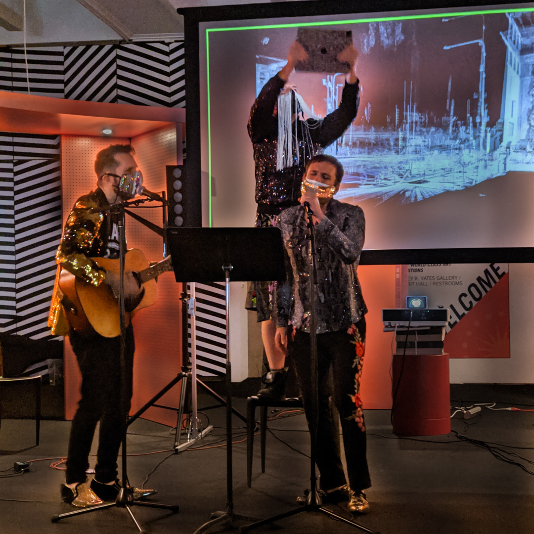 The Tenders is an evolving series of live, remote, and hybrid mixed reality performances engaging with the cover song as a means of exploring the ways in which personal and political histories are written, re-written, and written over. The performances juxtapose a complete 3d reproduction of the bedazzled home of self-taught artist Loy Bowlin — “the original rhinestone cowboy,” a persona fashioned after a popular 1975 Glen Campbell (cover) song — with 3d scans of the former site of Fort Dearborn, an early American white settler garrison. Placing the flamboyant tradition of the rhinestone cowboy in relation to the history of indigenous genocide and expulsion, The Tenders project seeks to invert and queer colonial narratives lodged deep within the American imaginary.