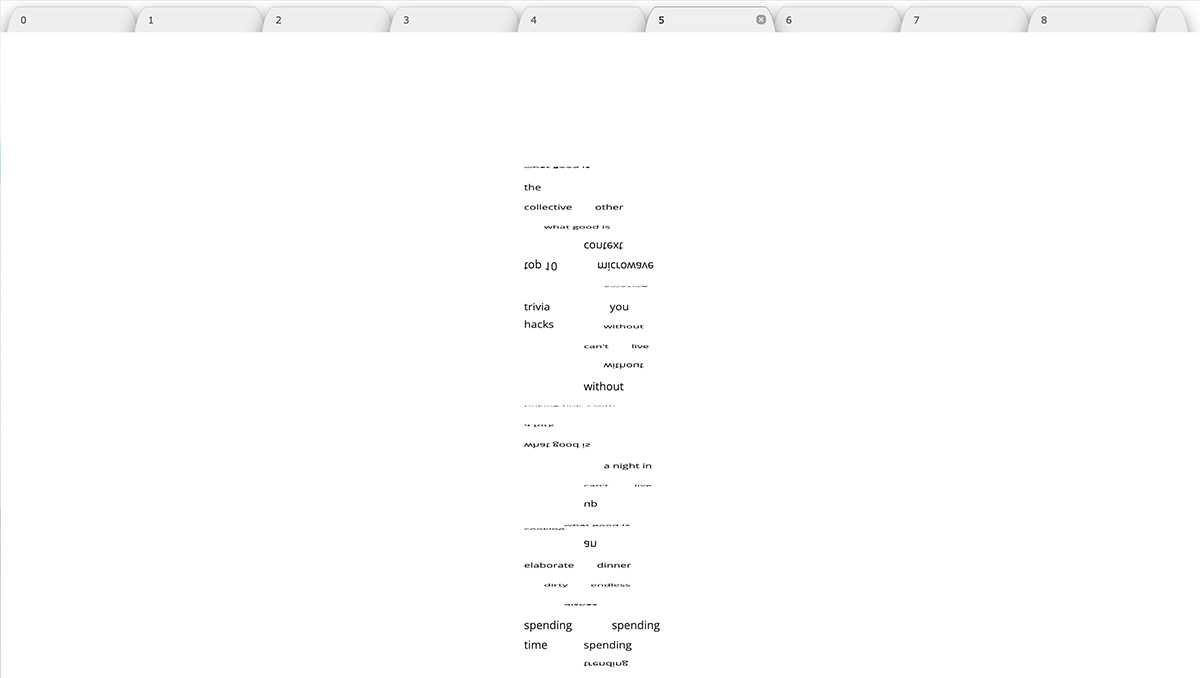 The process of reading and writing digital projects is performance. It is thinking-through-making and the embodied practice of organizing ideas. Through the gesture of transformative exchange, readers and writers co-create new experimental frameworks to surface the indeterminacy of the ‘born-digital’ as a tangible space, place, and sensorial site of study. The artists and writers included in this issue touch, twist, and push against a world presented as fixed.