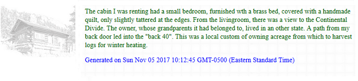 3. Images. The images in Arriving Simultaneously on Multiple Far-Flung Systems are planned to be flexible, by which I mean that the texts they refer to will change. For instance, the cabin image initially combines with Diana's workplace, but it will also combine with her love affair with and eventual marriage to Roland. A chart of all the images in Arriving Simultaneously (so far) needs to be created and keyed to credits to the source of each image. Although I used images as icons to key text in maps; in my card catalog The Woodpile (1979); in the early web version of the Blue Notebook (Uncle Roger File 2); as well as in A Party at Silver Beach, the use of images in my work has not been predominant since the days of making maps and "card catalog"-based narratives. Thus, I would like to also call attention to JR Carpenter's algorithmic electronic manuscripts, created with integrated images and generative text -- as well as to Deena Larsen's combinations of images and text in Marble Springs -- as being innovative examples of the use of images in conjunction with story-bearing text [..] In the case of Arriving Simultaneously, because the text is generated from different modules, ultimately, the images are important in situating the reader within fluctuating time-frames in the narrator's life. In order that they be meaning-laden but not didactic, many of the images are designed to fade unobtrusively into the background.