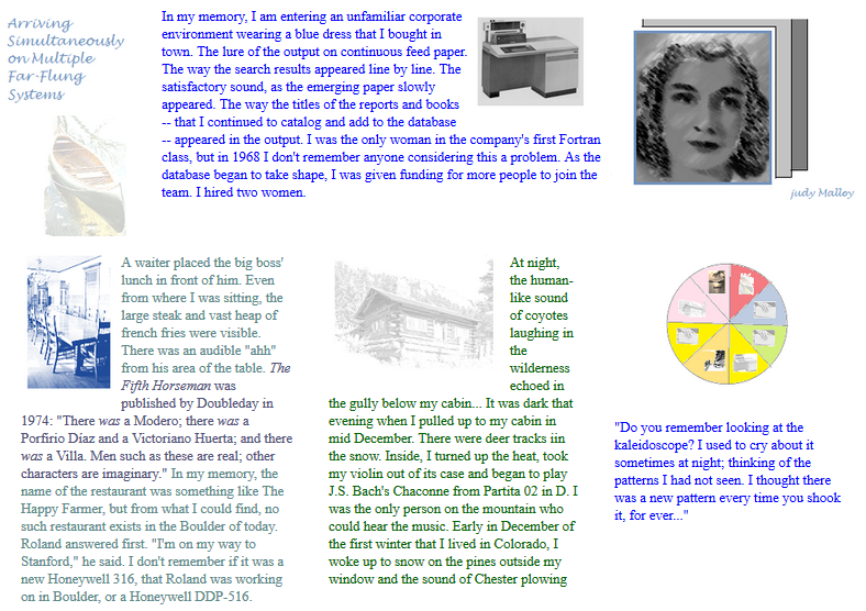 [...]When the kaleidoscope icon appears and is selected, the reader moves to an environment with fewer rogue punch cards. Instead, various playable iterations of the manuscript appear. [...]I admit to remembered sadness when this icon and text were put in place. It is clear that Diana will soon be leaving the mountains. R egarding, the difference between Jenny's experience of [chip industry] tech industry culture in Uncle Roger and Diana's experience of tech industry culture in Arriving Simultaneously on Multiple Far-Flung Systems, I would like to emphasize that both Ball Aerospace and Xerox PARC were important, productive, and harassment-free experiences. Working for an aerospace company at the height of the space race was an unforgettable view of space technology. Furthermore, Ball gave teams and individuals the access and power to develop needed systems on their own initiative and in this way encouraged invention and innovation. Twenty years later, at a different time of my life, Xerox PARC was the most hospitable environment I have ever experienced as regards not only my own work, but also the experience of an office in PARC's legendary Computer Science Lab (CSL) with access to an unparalleled array of research and development -- and later the opportunity to work with distinguished hypertext programmer, Cathy Marshall. It is important that young woman, who want to become software engineers, are aware that in the real world, there are welcoming environments. [...]The story relevant to today's notebook entry is the emergence of histories of women and engineers/software engineers in space exploration. As the Mercury 13 woman astronauts found out in the 1960's, there were glass ceilings. Nevertheless, the work of the black women mathematicians/computer programmers at Langley -- and the work of the women mathematicians and computer programmers at JPL, including Chinese American Helen Ling and African American Janez Lawson -- was extraordinary. Arriving Simultaneously draws on my own much earlier experience in working with information technology at Ball Aerospace (then BBRC) in the late 1960's. But it is a pleasure to note that 25 years later the number of women at Ball Aerospace and JPL who worked in core positions on the Deep Impact Mission (launched in 2005) is inspirational. They included Systems Engineering Lead Amy Walsh, a 2006 Women In Aerospace Award Winner for her work on Deep Impact (Ball); Senior Engineer, Lorna Hess-Frey, Flyby Structures & Mechanisms Lead, Deep Impact (Ball); Michelle Goldman, Project Engineer in Systems Testing, Deep Impact (Ball); and Jennifer Rocca, Launch Activity Lead, Deep Impact (JPL). Astronomer Karen J. Meech at the University of Hawaii was the Coordinator of Earth-Based Observations. Other women who worked on Deep Impact were Systems Design Engineer Sheryl Atterberg (Ball); Software Stress Tester Kavita Kaur (JPL); and Leticia Montanez, Testbed Manager, Deep Impact (JPL). Much of this history (of course also focusing on the work of the male engineers), is well documented in Todd Neff's From Jars to the Stars: How Ball came to build a comet-hunting machine. (Denver, CO: Earthview Media, 2010) Because of its detailed documentation of the development of an amazing array of systems, this book is of value to anyone interested in innovation --- including new media artists. C ontingently, I am thrilled to see that this Spring, the University of Illinois Press will be releasing New Media Futures The Rise of Women in the Digital Arts, edited by Donna Cox, Ellen Sandor, and Janine Fron; Forewords by Lisa Wainwright, Anne Balsamo, and Judy Malloy. As I noted in my foreword to this book: "Presenting individual histories as situated in the development of the technologies themselves, New Media Futures not only provides multiple models for women interested in exploring the computer-mediated creative arts but also documents the challenges of creating digital art from the late seventies to the early nineties. Application software, for instance, was unlikely at the time when many of the artists in this book began working. Explanatory books were scarce; programs were created from scratch, often taking the form of a stack of punch cards. As Lucy Petrovic, whose work focuses on human-computer interactivity and virtual reality environments, observes in this book: 'We were writing code, step-by-step. Initially that was the only way to create art on the computer.' " |