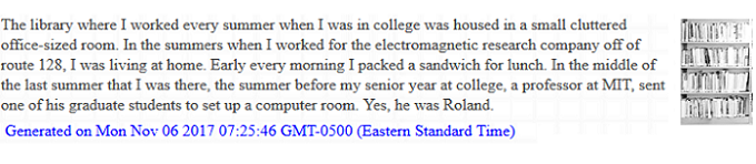 November 25, 2017 O n Thanksgiving Day. it was a pleasure to talk with my family in California, and then I made some variations in the interface design of the first dynamic Arriving Simultaneously on Multiple Far-Flung Systems manuscript. Later, sitting in the woods (evading the FORTRAN IV manual), I went back in time to write a little more for the "route 128" array. It was a beautiful winter day, and somehow I veered into working at the Harvard Coop bookstore during Christmas vacations -- an experience I like to remember. So, I gave it to Diana. For the record, this being a notebook, a few examples of the current interface design and of the new text in the output are recorded below. The purpose of doing this is to compare the changes with what existed before. Sometimes -- this may be one of those times -- a decision to revert to the original may be made.