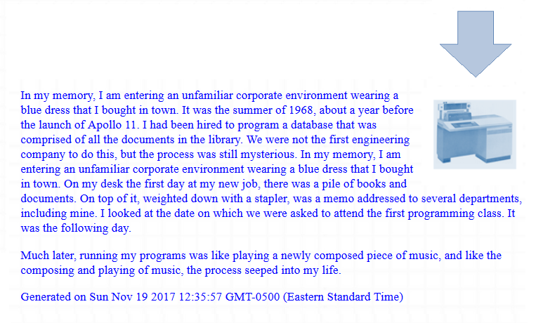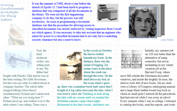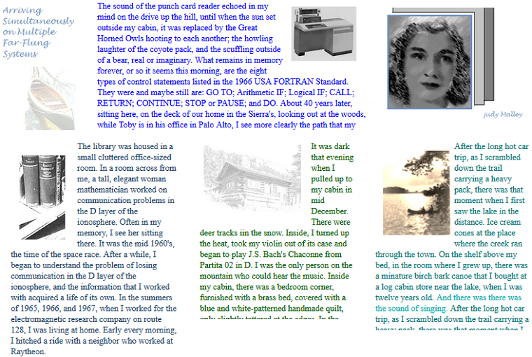 December 10-11, 2017 A rriving Simultaneously on Multiple Far-Flung Systems is a generative electronic manuscript. The first "page" in this work -- the page I am working on now -- is composed with six arrays and a few associated unconventionally-nested arrays. As I, the writer, mine my memories to convey the experience of the computerization of a Colorado aerospace technical library in the late 1960's, the reader of this work experiences the spare, compressed memories that would be expected from a narrator, who is looking at her life many years later. We don't remember sequentially. I repeat. We use the affordances of electronic literature to tell stories differently. As with any form of writing, the whole takes a while to come together. At night running and rerunning Arriving Simultaneously on my tablet allows an understanding of the flow of a work in which increasingly, no one reader will ever see the same screen. At night, reading narratives of earlier eras when women programmers were expected and welcomed, the stories of women coding -- not only during World War II but also in the 1950's and 1960's --emerge. Earlier this fall, reading Margot Lee Shetterly Hidden Figures - The American Dream and the Untold Story of the Black Women Mathematicians Who Helped Win the Space Race, I was immersed in the extraordinary lives of Katherine Johnson, Dorothy Vaughan, Mary Jackson, and Christine Darden and many others. In October, immersed in Julianne Nyhan and Andrew Flinn's Computation and the Humanities: Towards an Oral History of Digital Humanities, I explored the role of early computing in the history of the digital humanities. In November, Nathalia Holt's Rise of the Rocket Girls: The Women Who Propelled Us, from Missiles to the Moon to Mars stared at me from a library shelf. Initially, turned off by the 50's hairstyles and culture, I checked out the Wonder Woman DVD instead. A week later I returned and checked out Rise of the Rocket Girls. Soon, I was deep into the work of the women mathematician/computer programers at JPL. Helen Ling, Barbara Paulson, Susan Finley, Sylvia Lundy Miller, and many others. By the time I had finished, from a media archeology point of view, I felt as if the culture of the 1950's -- and how these women emerged from that culture -- was important in the narrative -- just as the maverick culture of Boulder Colorado is important in Todd Neff's From Jars to the Stars. And yes, Neff does describe what the men did in their spare time and even sometimes what they wore. F or Arriving Simultaneously, I could have created a woman mathematician. That was my original intention, but the details of the life of a mathematician were not in my memory. Instead, Diana is a music major [I was not a music major, but I played the violin and was familiar with this territory], an early information retrieval programmer for a NASA contractor (at a time when information retrieval systems were not well developed and documented), a Silicon Valley-based database designer, and eventually a core figure in computer-mediated community networking. It was at Leopold Records in Berkeley, when Community Memory was installed there in 1973, that Diana first encountered community networking. And at its core, Arriving Simultaneously is an Internet story, that celebrates in spirit all the men and women who built the non-profit communities of the Internet. However, with Electromagnetic Research Corporation running fictionalized in the background [avoiding for consistency, the complexities of real life, I moved ERC from College Park, MD to route 128 outside of Boston], the story begins in a NASA contractor's technical library in the late 1960's.