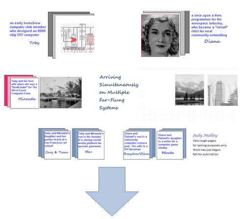 L ater on Thanksgiving evening, I was continually generating the manuscript on my tablet -- looking for mistakes and getting a feel for how the arrays work together, when I began to feel as if Diana was talking to me -- an eerie experience that I have never before had as a writer. It would be more common to merge with the personality of the character. As is my usual practice, and because I need to test how it runs on a tablet, the in-progress first manuscript page of Arriving Simultaneously on Multiple Far-Flung Systems is now online at https://people.well.com/user/jmalloy/arriving/diana_icon_interface.html This is not the top page because the top page won't be finished until all the manuscripts it accesses are completed. To both give the reader more details and avoid too much repetition, each array should contain about 40 variables. There are 6 arrays, each now containing about 10-20 variables, so there is much more writing to do. Reader, remember, if you visit this work in progress, that each icon randomly generates a different array, and that since I will be adding new writing as often as possible, the work will be in flux -- at least until January when I begin to work on the second Arriving Simultaneously on Multiple Far-Flung Systems manuscript. The second manuscript will take place in Silicon Valley.