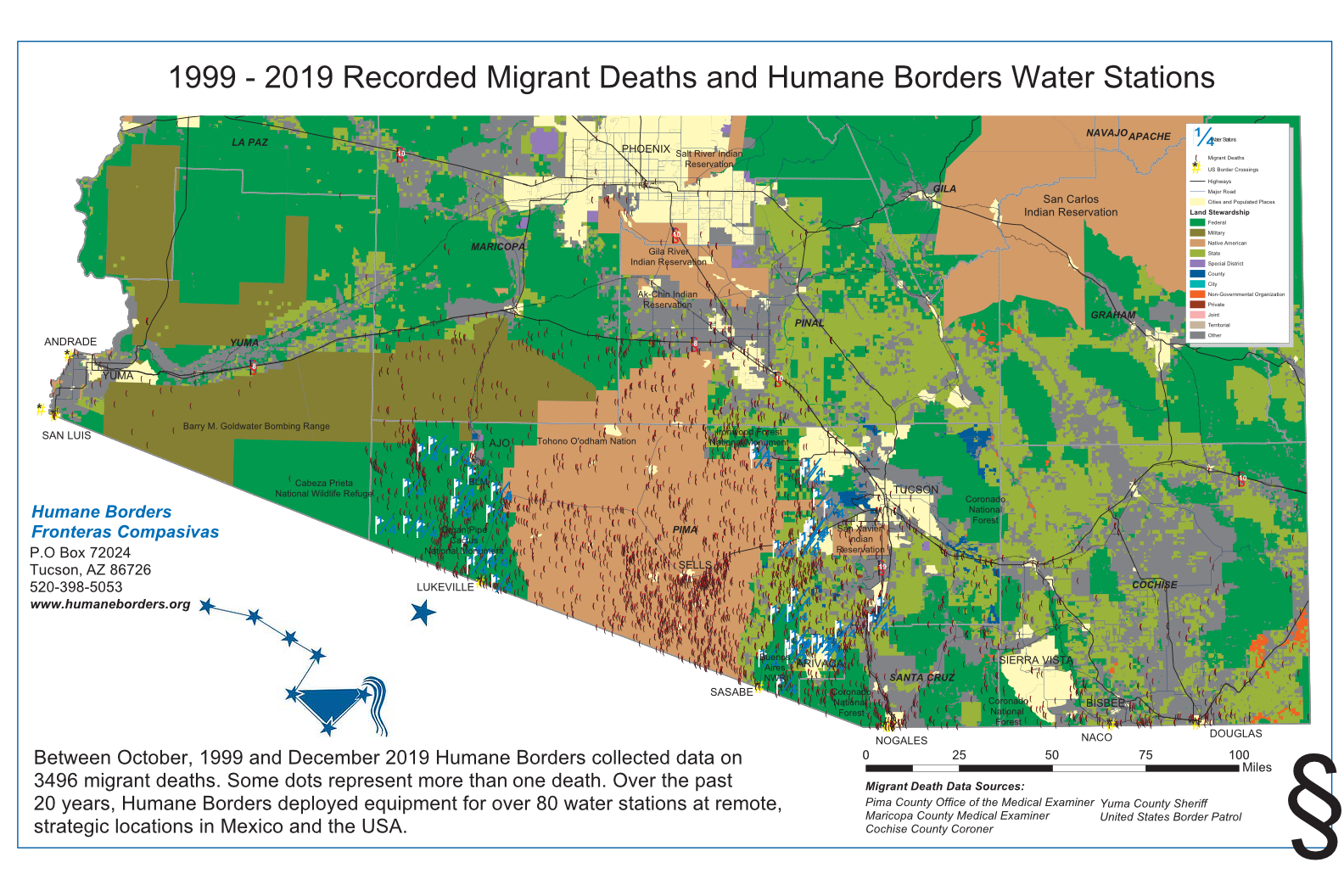 In conjunction with the migrant aid organization, Humane Borders, the Pima County Office of the Medical Examiner has documented upwards of 3,000 migrant deaths dating back to 2001Footnotes:(The Pima County Office of the Medical Examiner is currently working to recover more information about older deaths including those that occurred in the 1990’s. See humaneborders.org for more information. ). The Office of the Medical Examiner has made these deaths visible in two important ways —posters made and posted by Humane Borders and interactive map with an accompanying searchable database. On both maps red dots serve as an indication of the site where a migrant body was recovered. The entirety of Southern Arizona is covered in a sea of red dots — migrant deaths are widespread both spatially and temporally. Similarly, the interactive map contains more comprehensive data about each death including the individuals’ name and age, as well as coordinates and recovery date. It is important to note that the Pima County Office of the Medical Examiner offers robust information about these migrant deaths in large part because the Arizona landscape is comprised of mostly public lands. These deaths are documented because of where they occur rather than some federal mandate. Conversely in Texas, where the land is 95% privately owned, there is a dearth of information about migrant deaths (Heinen). Ultimately, efforts to make migrant deaths visible fall to non-profit organizations, activist groups, and artists.