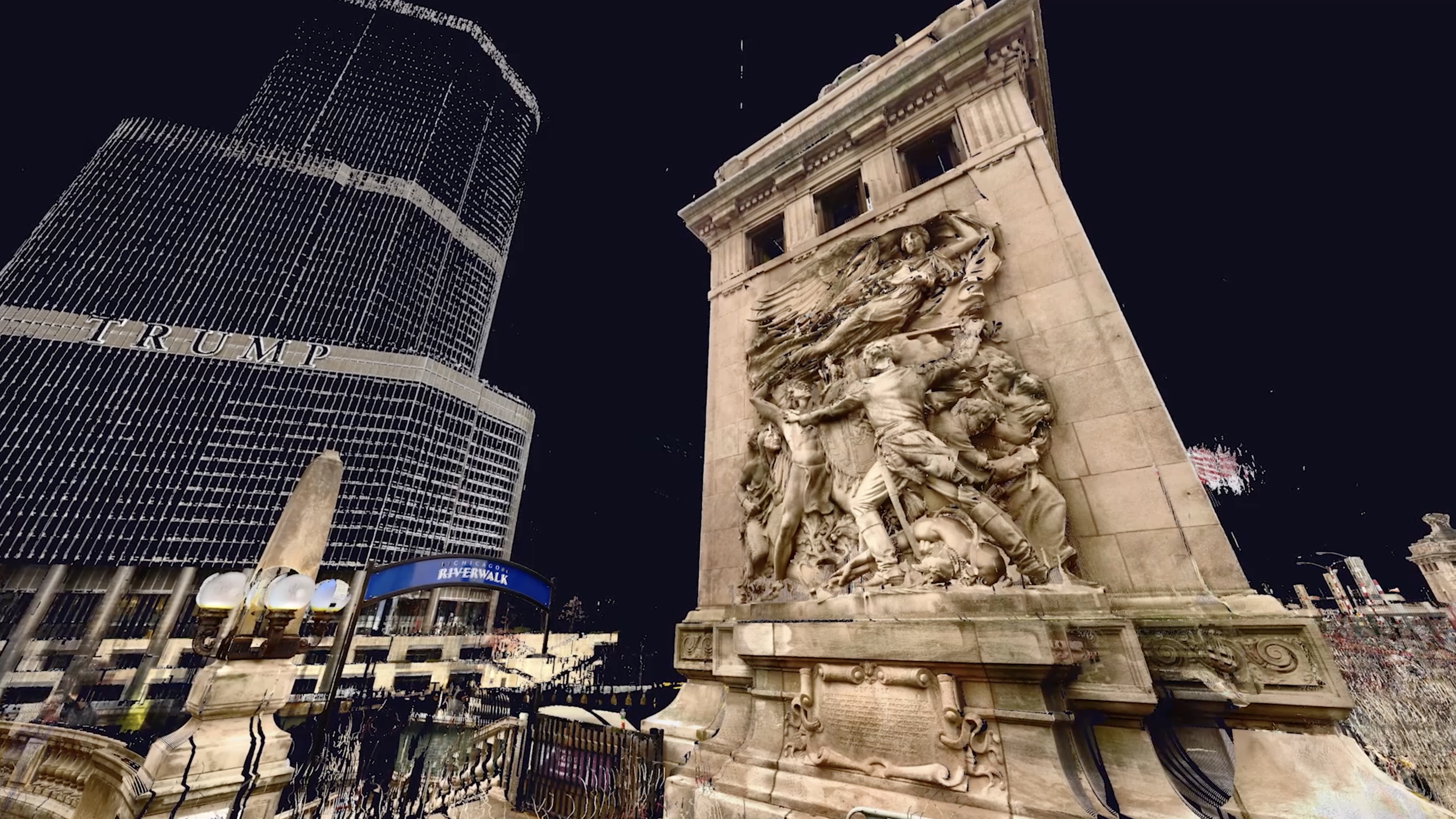 A still from one of the many videos layered throughout The Tenders; in this image we see a 3d scan of one of the four tender houses flanking the DuSable Bridge adorned by a bas-relief sculpture titled “Defense,” which illustrates the Battle of Fort Dearborn from the white settler perspective. Trump Tower looms in the background.